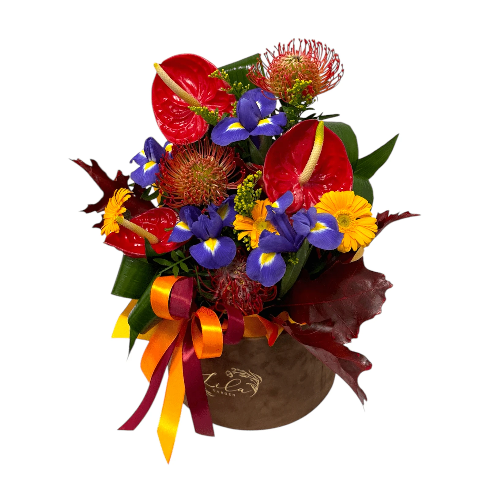 Fall arrangement of fall flowers, red anthurium, leucospermum, gerbera and iris, complemented by oak leaves, all placed in a lush velvet box in Cinnamon.