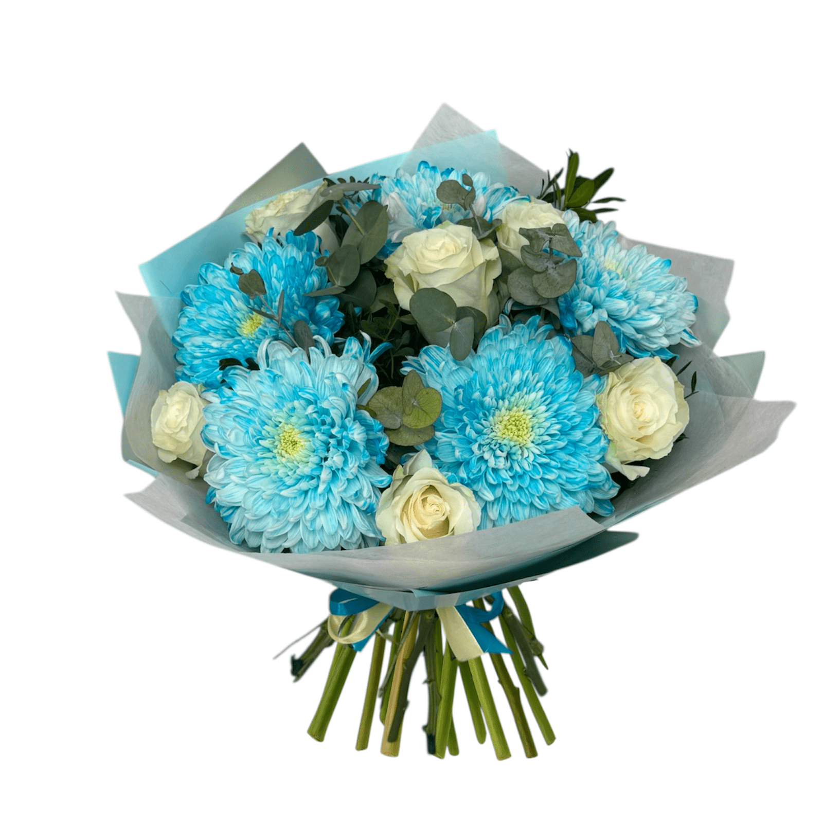 The blue bouquet contains 6 white roses, 5 fall chrysanthemums, eucalyptus and decorative greenery, wrapped in assorted packaging.