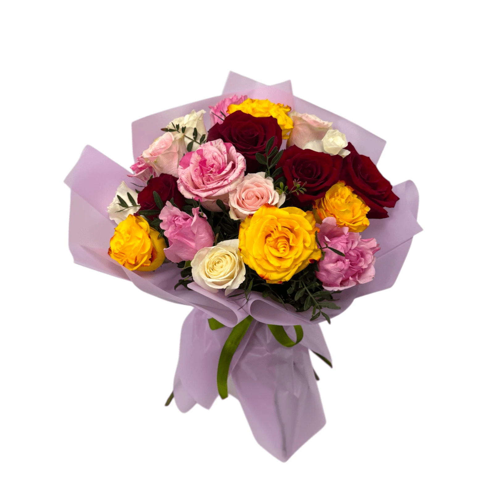 The bouquet with colorful roses is ideal for birthdays, anniversaries, name days or Valentine’s Day.
