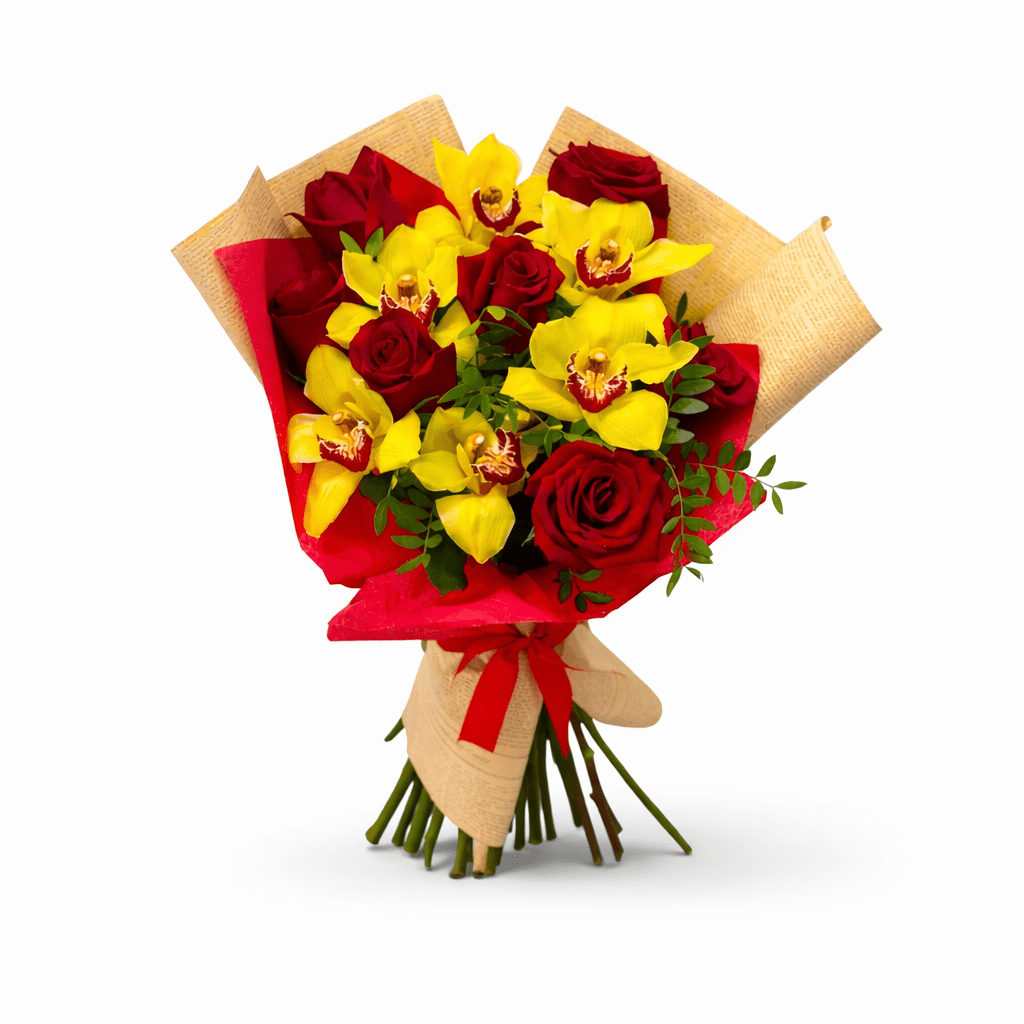 Special bouquet with cymbidium orchids and red roses, in Kraft paper packaging.