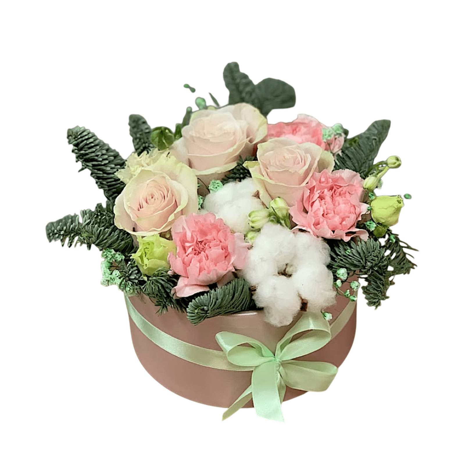 Box with fir tree and pink flowers, made with premium flowers, from Roses, Carnations and Lisianthus, natural cotton flowers.