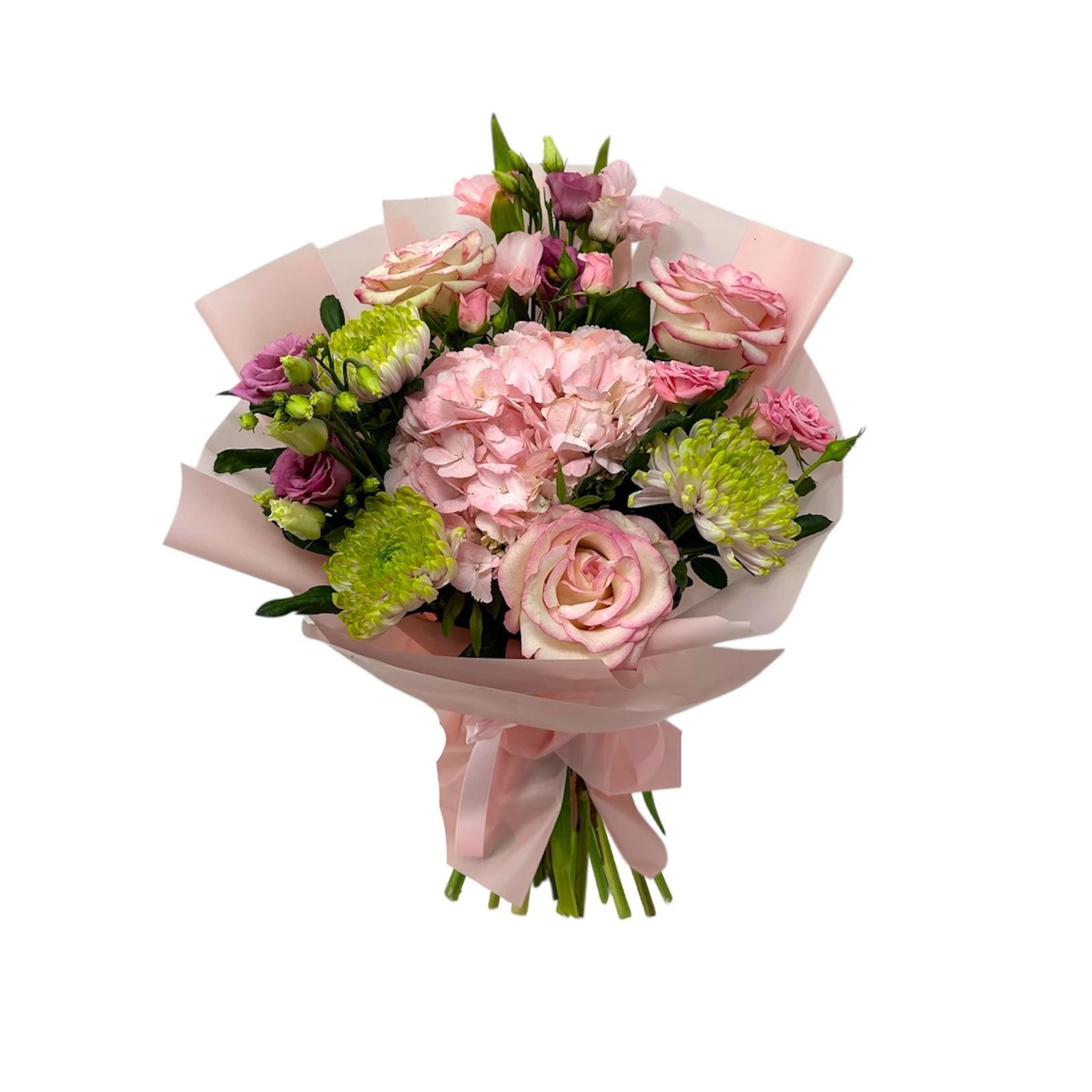 The hydrangea and chrysanthemum bouquet contains decorative greenery, lisianthus and roses. Some shades of the flowers may differ depending on the stock, while still preserving the bouquet’s beauty and color.