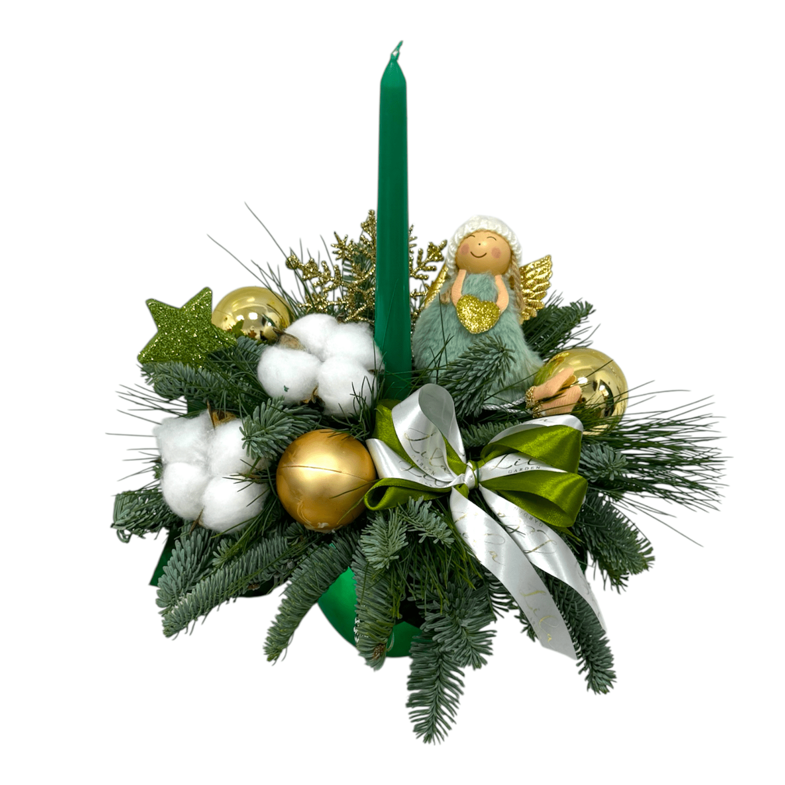 Festive arrangement with Silver natural fir tree and Green candle, in a polymeric vase, decorated with natural elements such as fir cones, cotton flowers, globes and an angel figurine.
