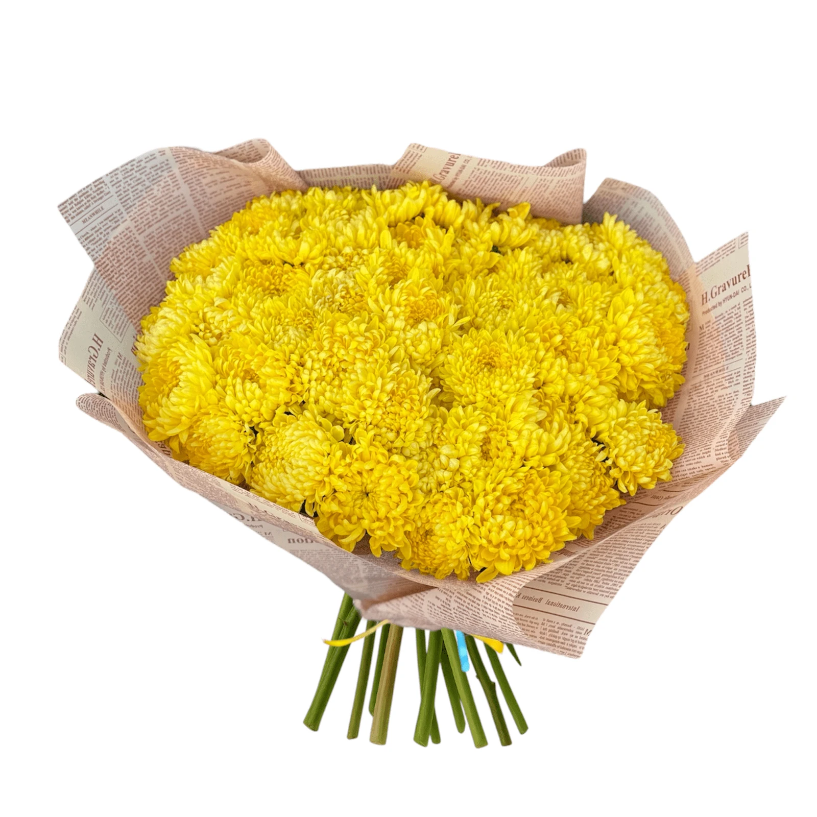 A colorful and fresh bouquet of yellow chrysanthemums. Ideal to bring smiles and a touch of fall to any occasion: birthdays, anniversaries, name days or simple gestures of appreciation.
