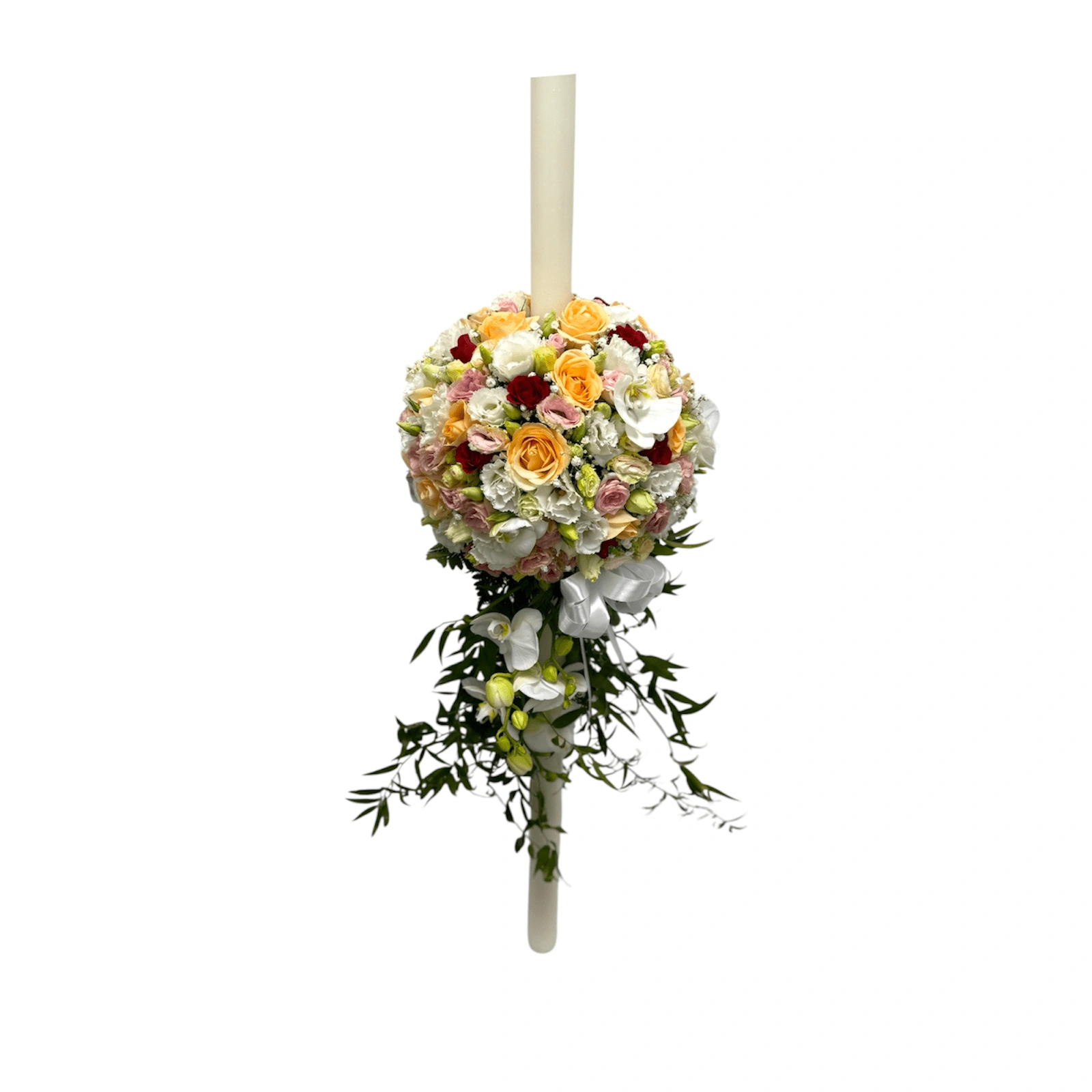 A 1.2m wedding candle with a colorful and delicate flower arrangement on a sponge ball, made of peach roses, pink and burgundy mini roses, colorful lisianthus, orchids and greenery, complemented by gypsophila.