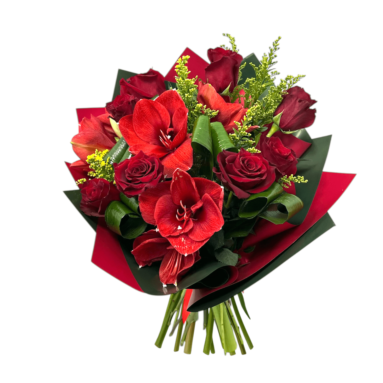 Charming and warming Christmas bouquet in shades of red, made with Ecuadorian roses and Amaryllis lilies, decorative greenery and solidago.