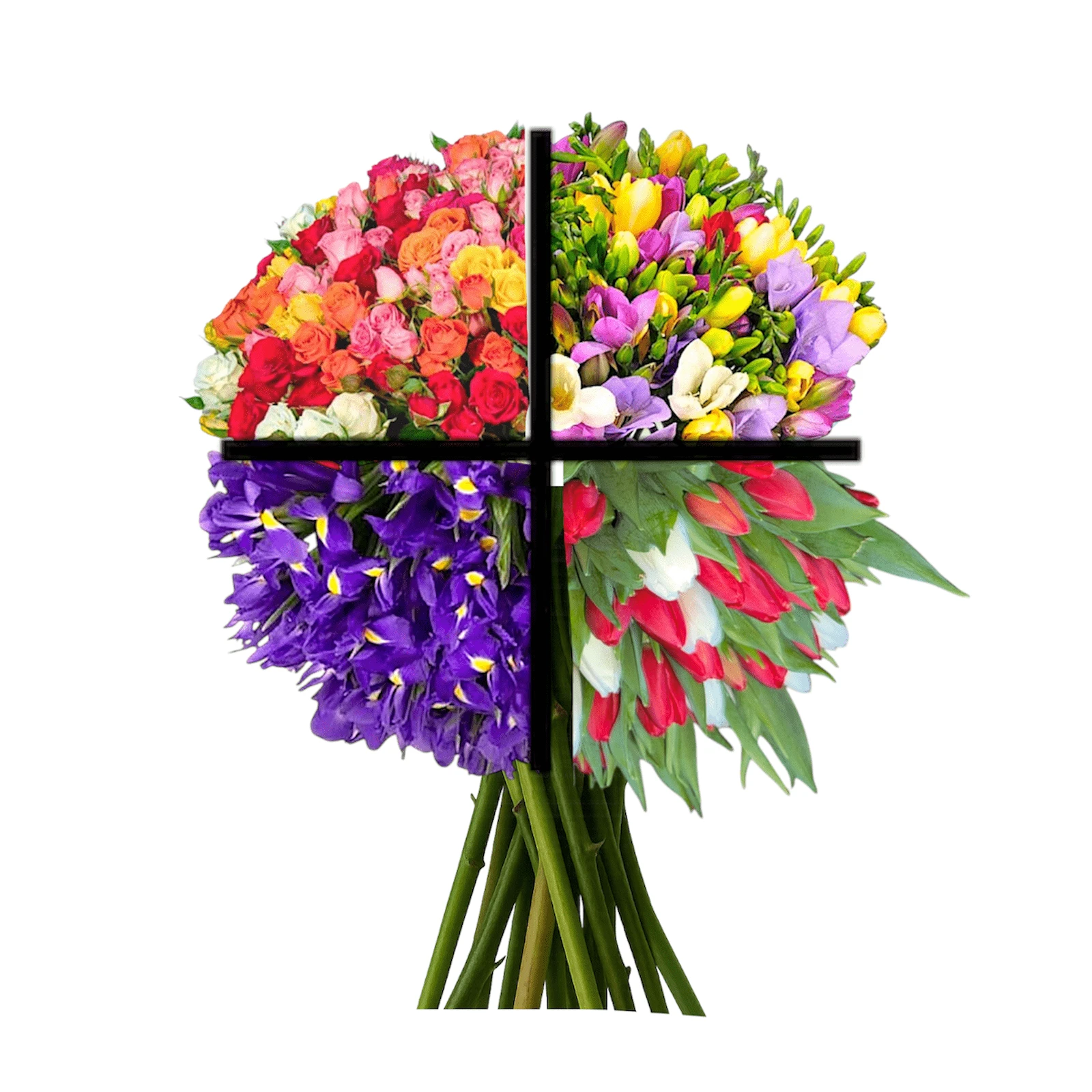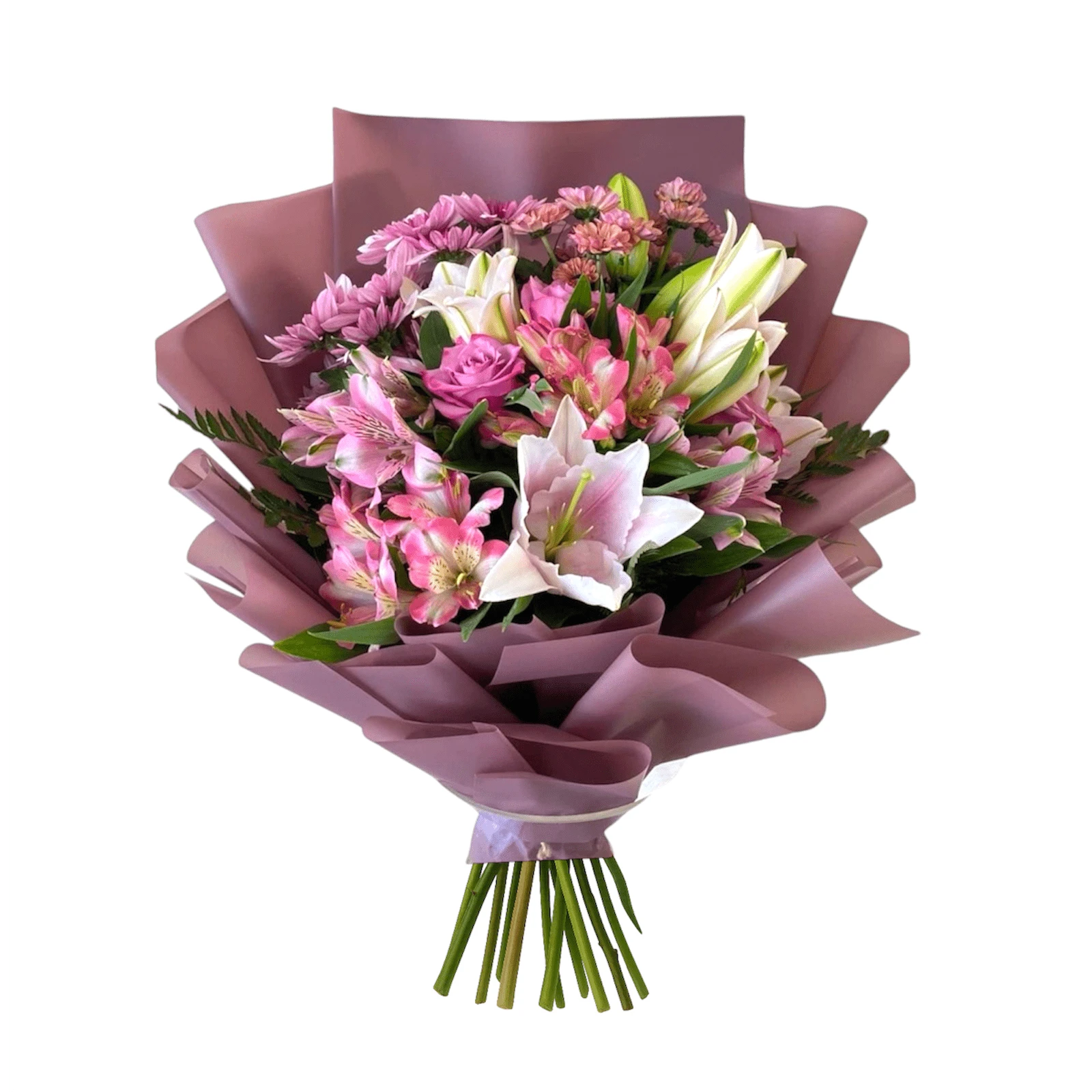 The bouquet of the day can contain flowers such as roses, chrysanthemums, lisianthus, tulips, freesias, irises or peonies, along with decorative greenery and matching packaging.