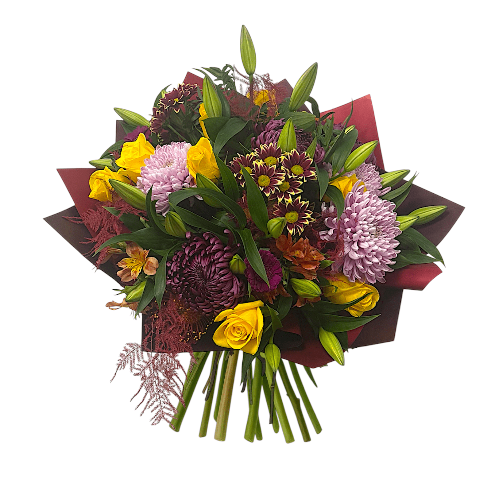 Autumn bouquet with scented lilies, roses and mix of chrysanthemums, alstroemeria and decorative greenery.