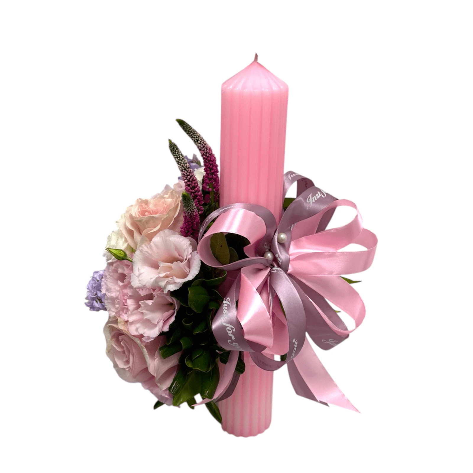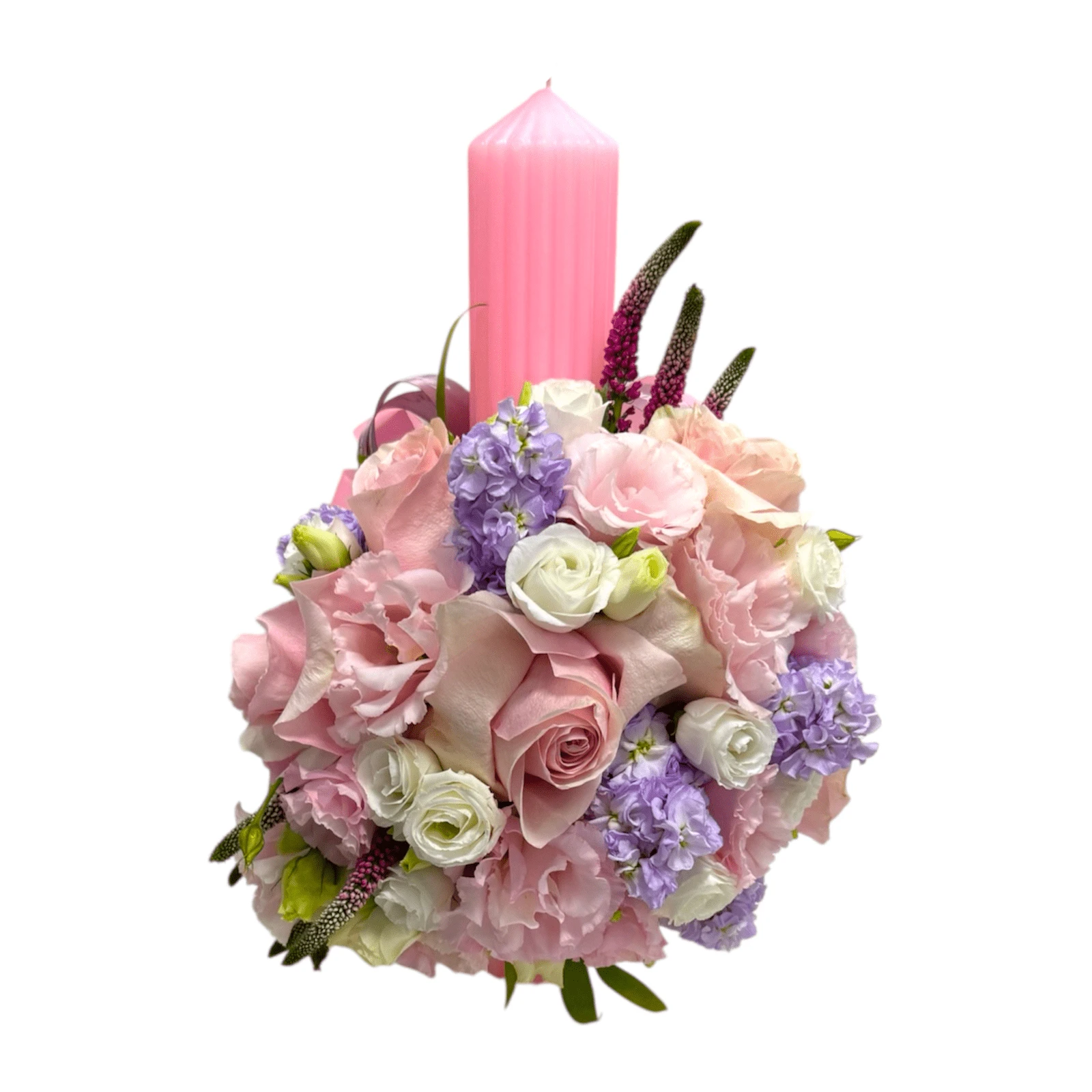 Pink christening candle for little girls with flowers in shades of pink, white and lilac, arrangement made in floral sponge on one side, accessorized with a double satin bow.