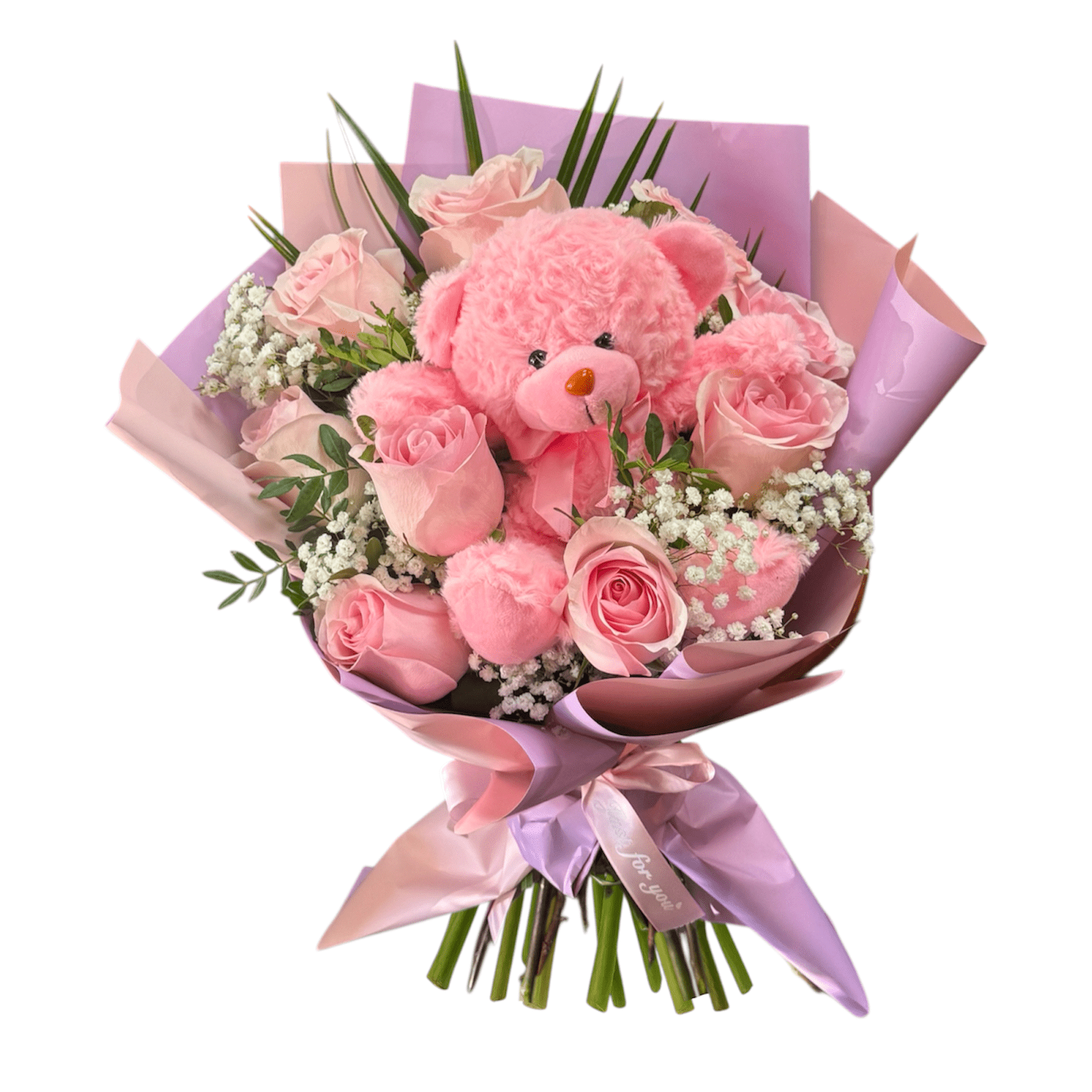 Bouquet of pink flowers with 9 Roses, a teddy bear and decorative greenery.
