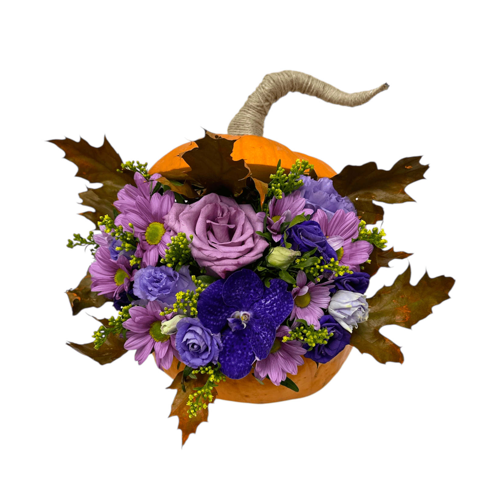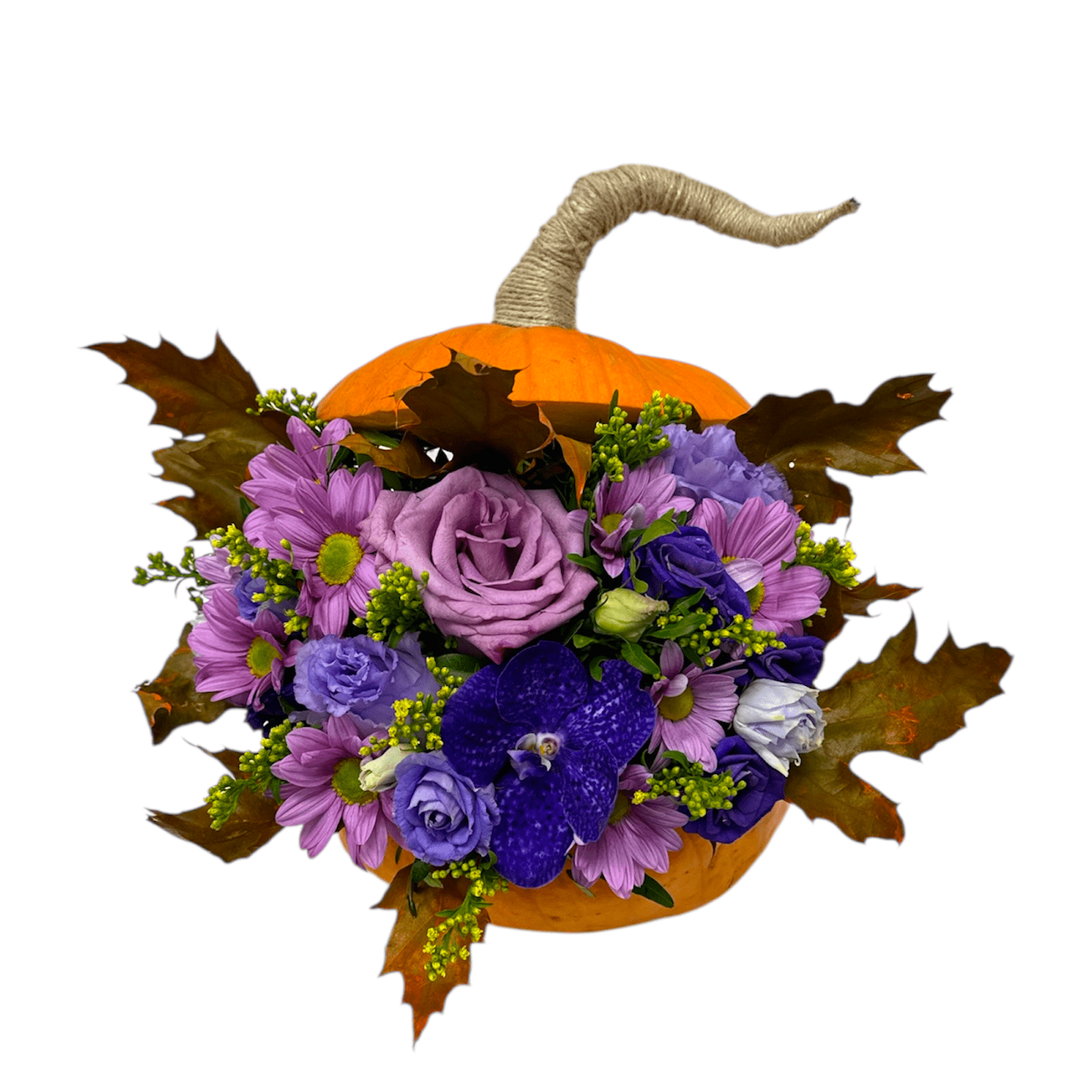 Pumpkin with purple blossoms in floral sponge, Halloween arrangement with purple-lilac mixed flowers and decorative fall foliage.