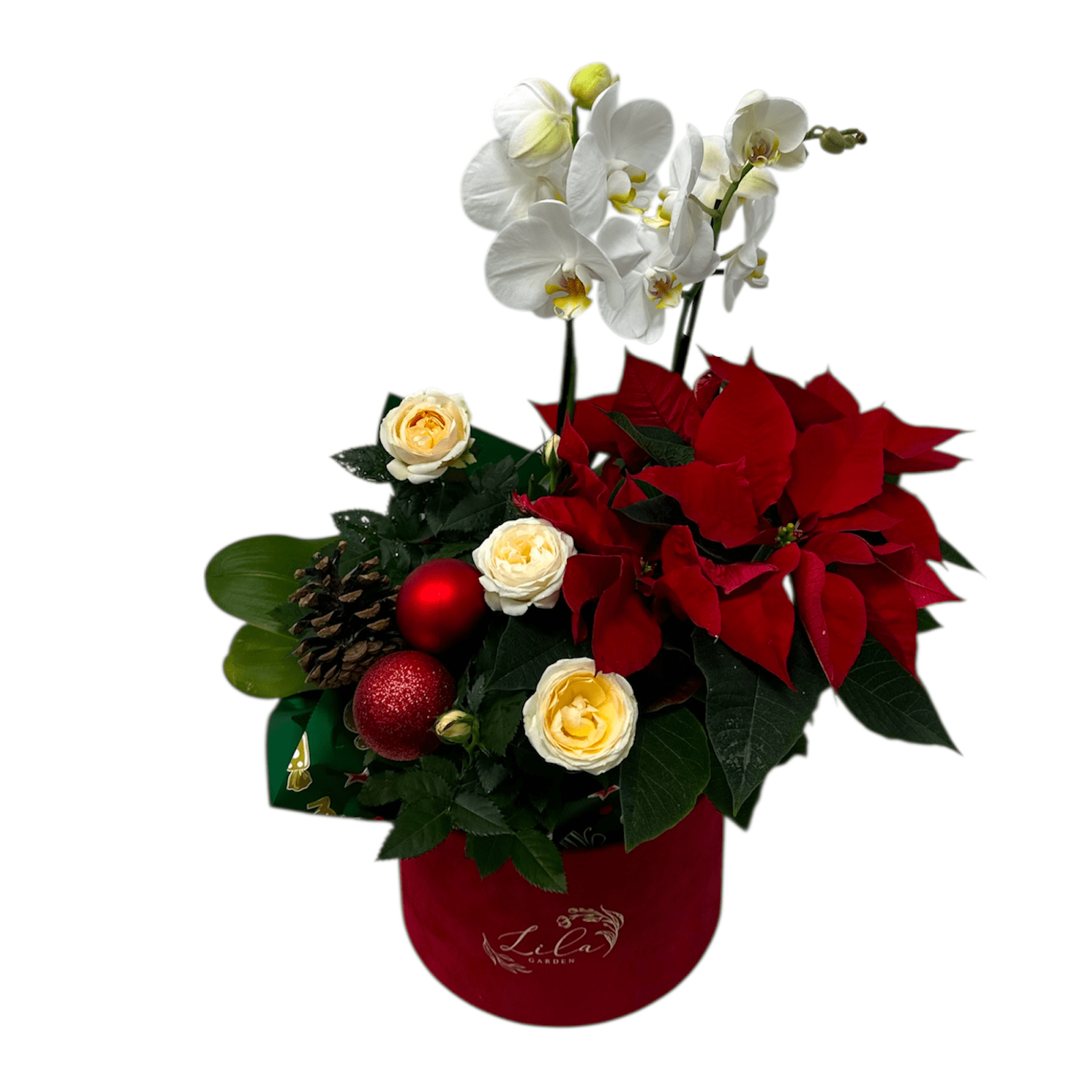 Winter plant arrangement with Christmas Star, orchids, roses and Christmas accessories.