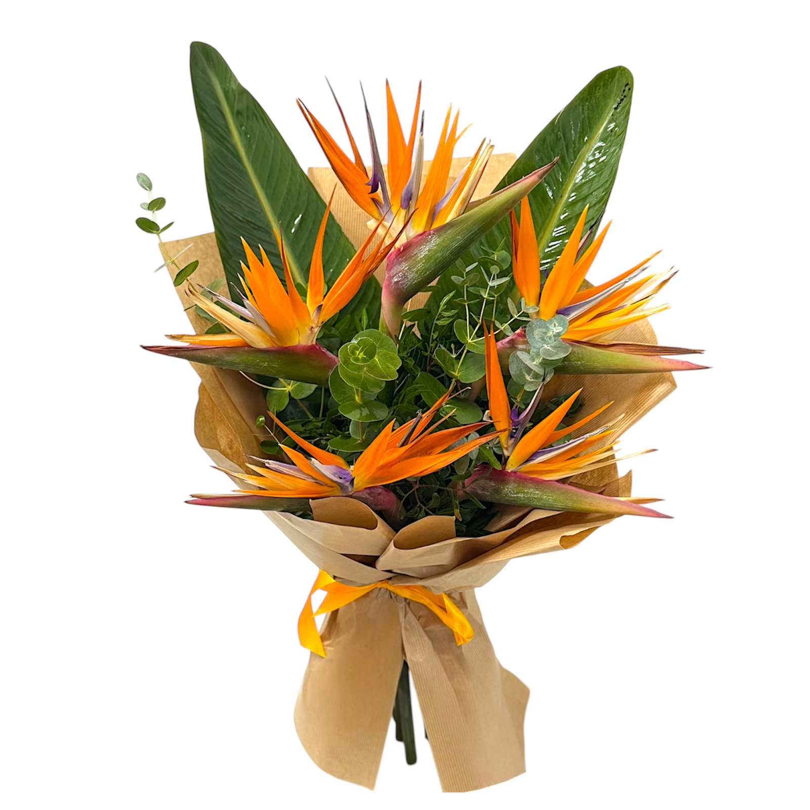 Exotic bouquet with orange strelitzia, a special flower originally from South America, creates a spectacular bouquet, in combination with fragrant eucalyptus, which has a resistance of up to 7-10 days in the vase.