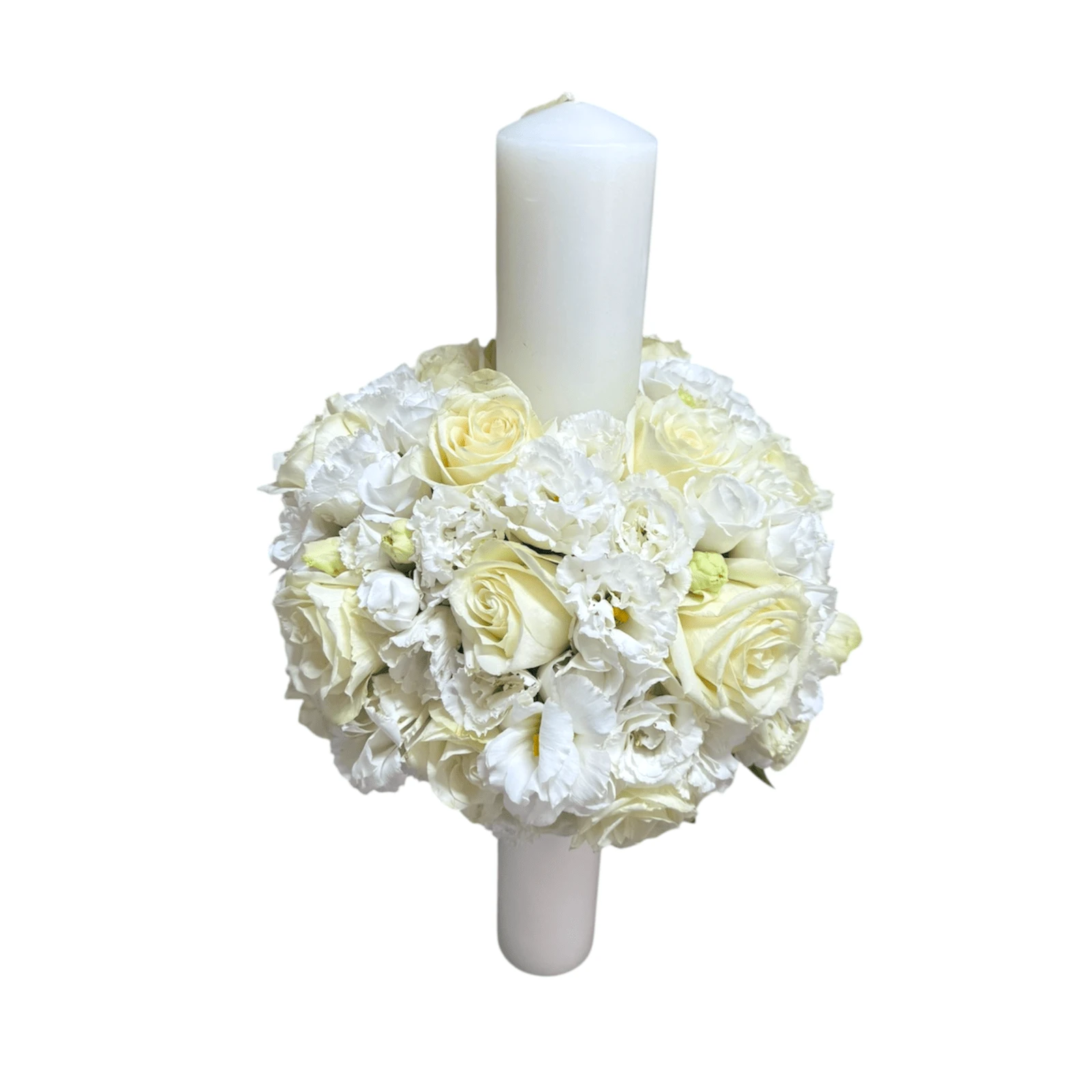 Wedding/wedding candle in round, water sponge, made of white flowers, roses and Lisianthus.