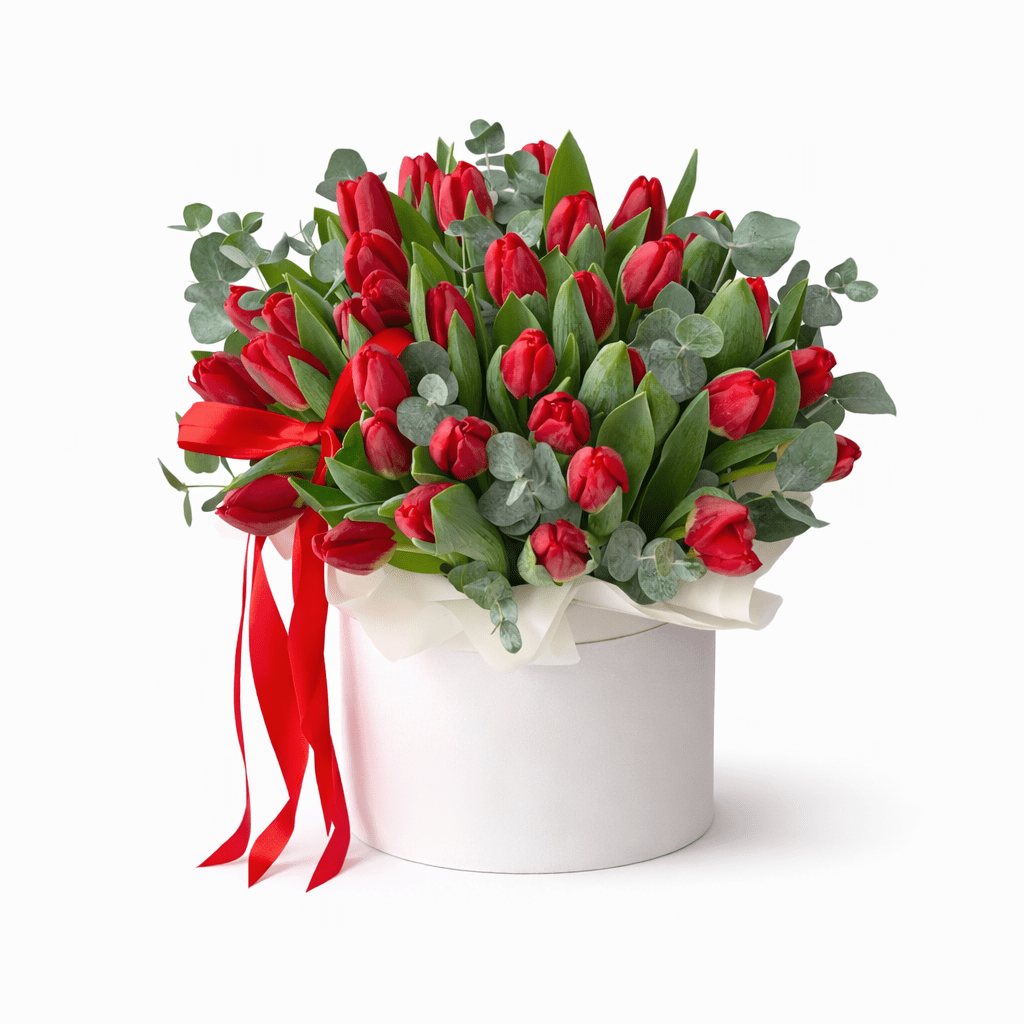 Cutie cu lalele roșii, un aranjament delicat și romantic perfect pentru iubita sau soție.