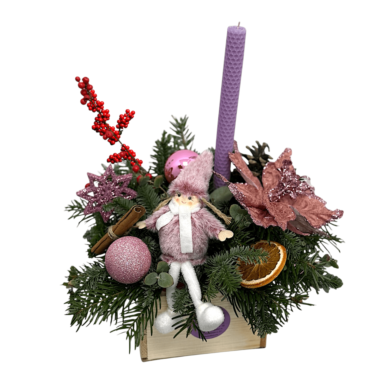 Cutie pentru masa festiva cu lumânare din ceara naturala parfumata, cu decorațiuni în nuanțe de mov-roz.