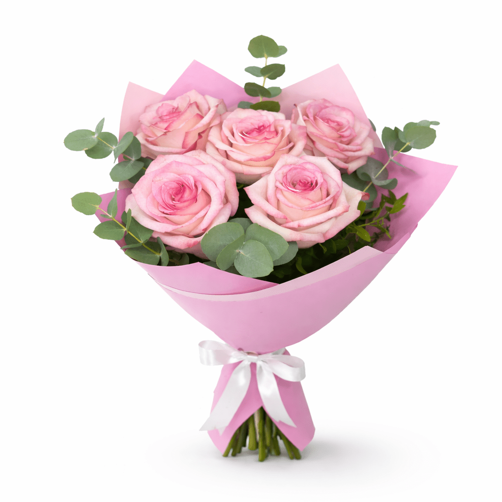 Buchet clasic din 5 trandafiri roz cu alb, eucalipt și verdeața decorativa, în ambalaj roz.