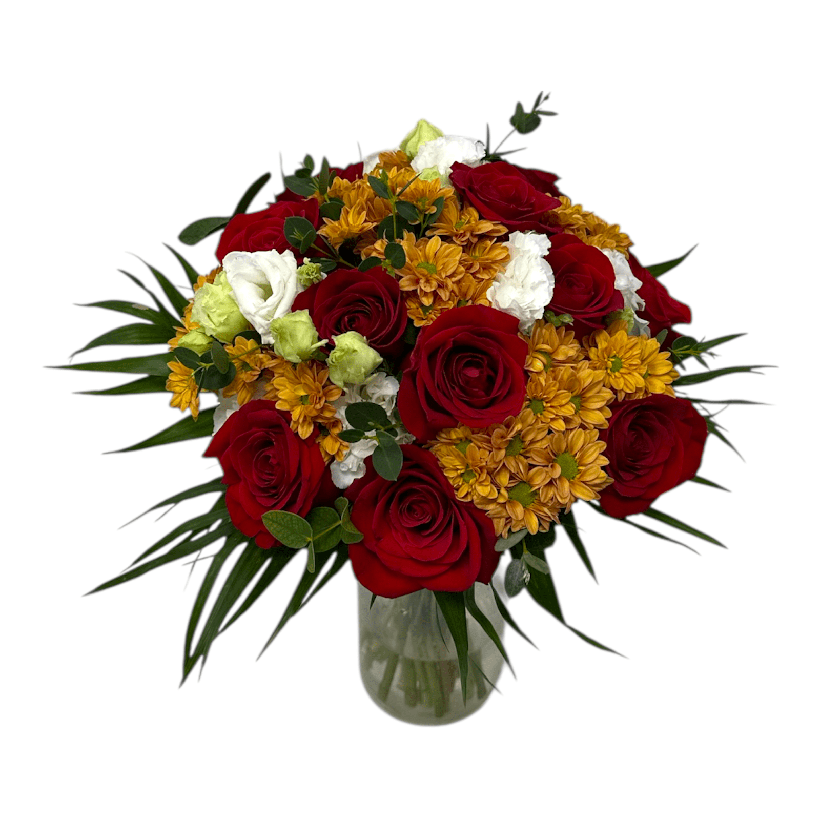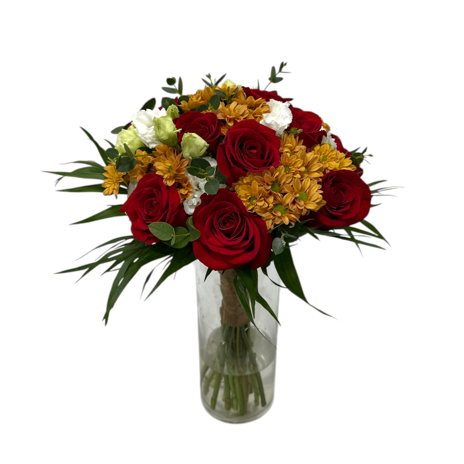 Buchet pentru eveniment cu trandafiri și crizanteme, perfect pentru nasa, dar și cununie, în nuanțe de toamna – aramii.