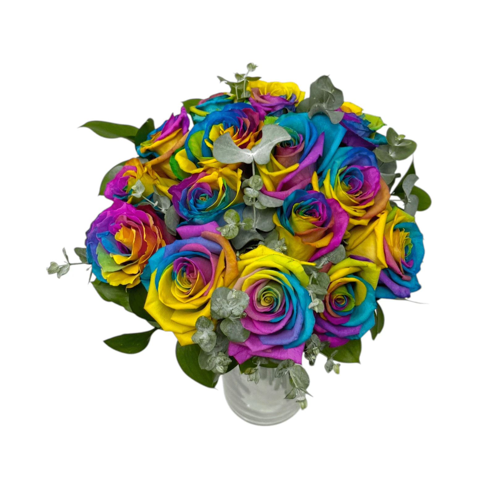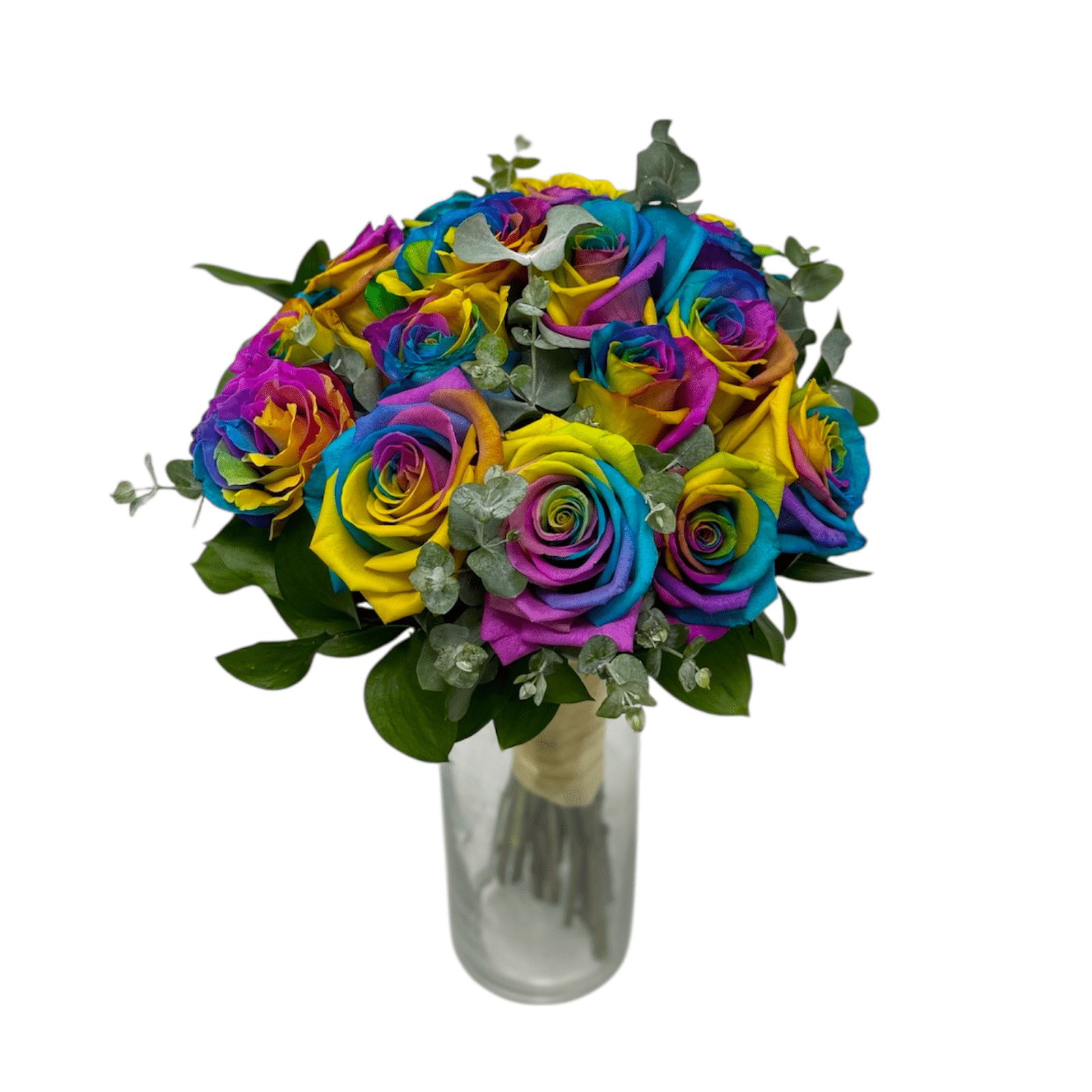 15 trandafiri Rainbow, eucalipt, panglica satin