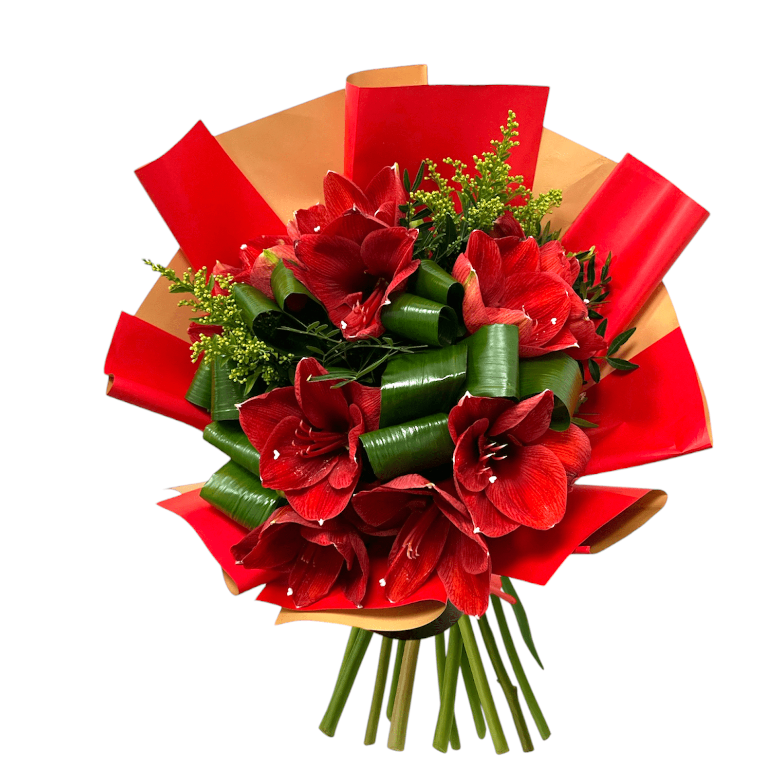 Buchet Amaryllis conține 5 fire de crin, 2 solidago, 5 aspidistra, pistacia și ambalaj roșu-auriu.