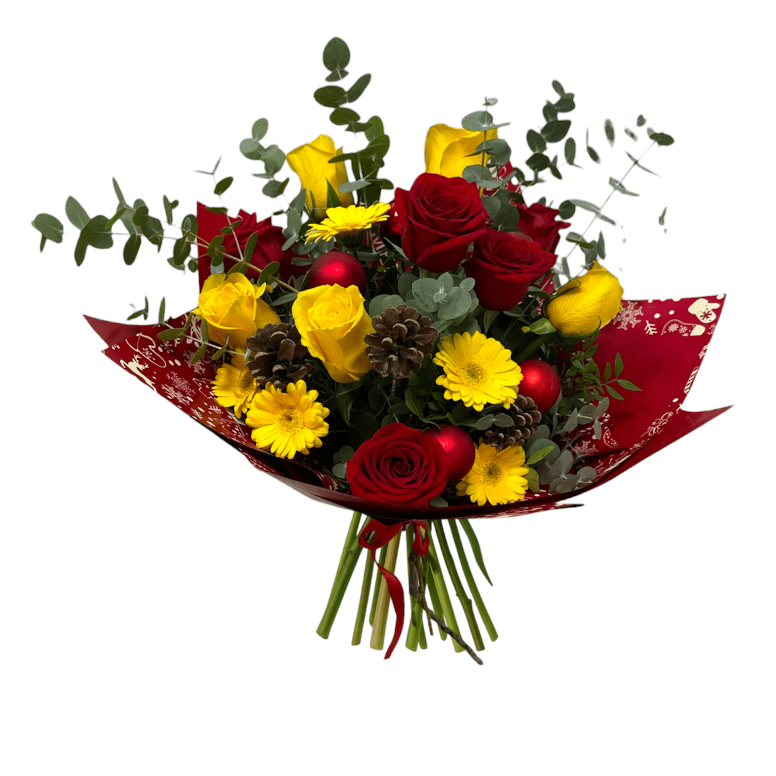 Buchet de flori de sărbătoare cu elemente naturale de conuri de brad, în combinație cu trandafiri roșii și galbeni, gerbera, globuri și eucalipt parfumat.