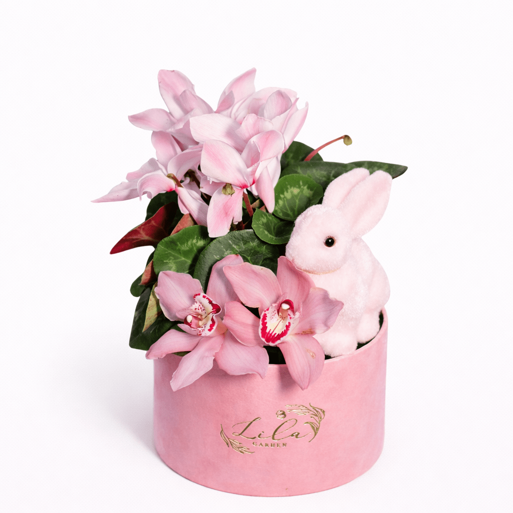 Cutie de catifea pentru cadou de paste cu planta la ghiveci cyclamen și cupe de orhidee, accesorizata cu iepuraș.