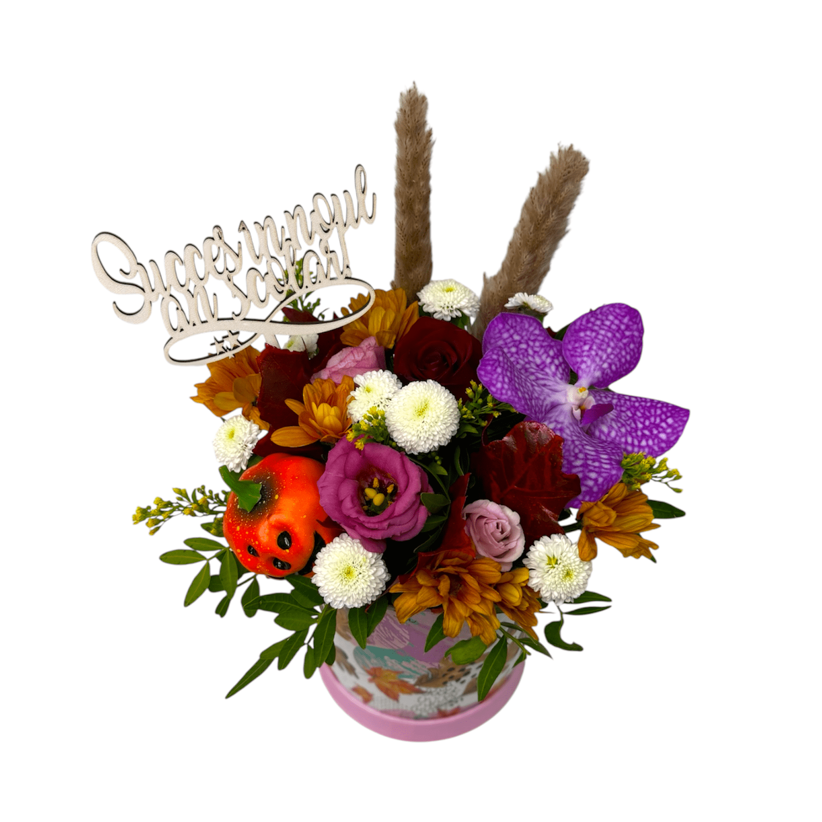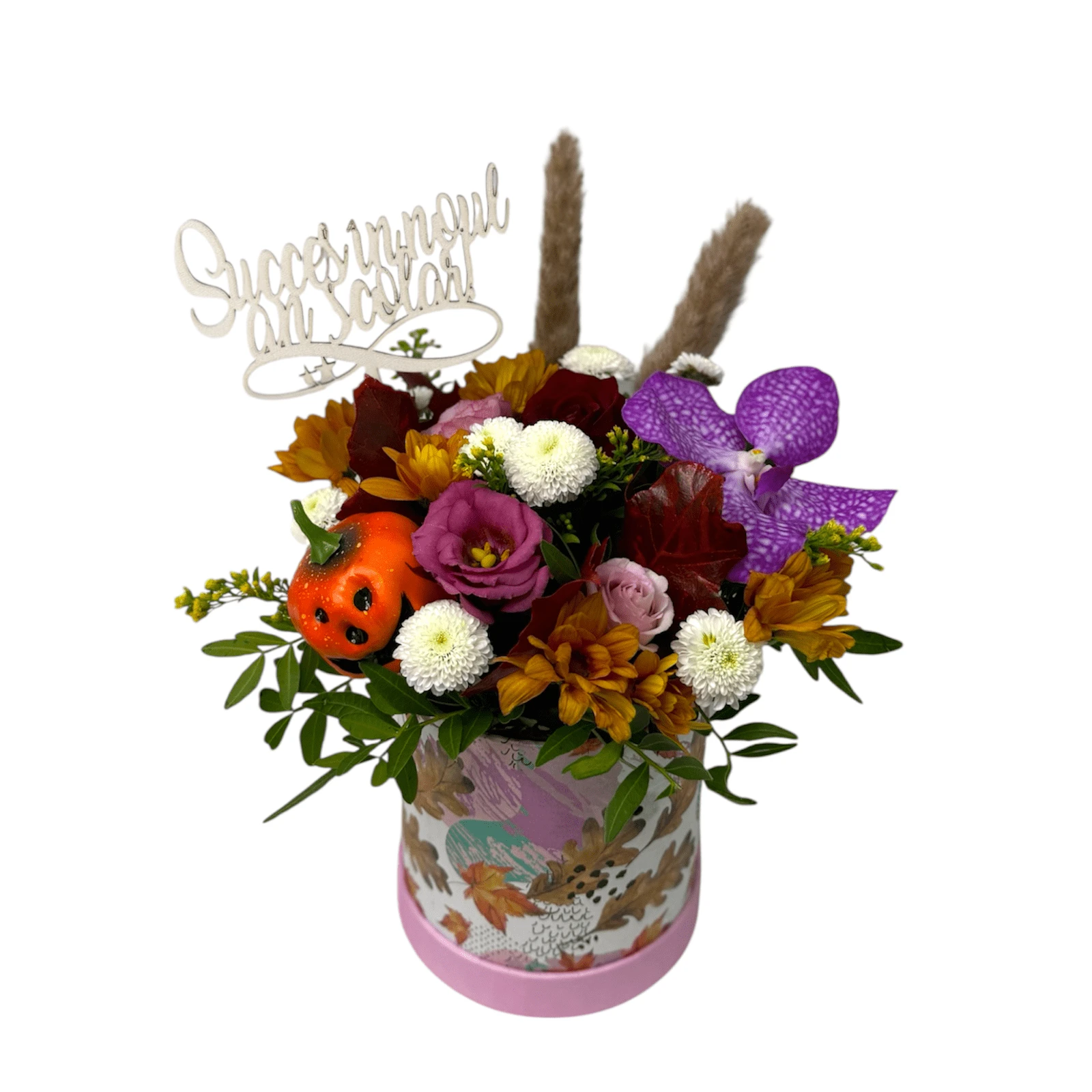 Aranjament de toamna in cutie cu flori de sezon, crizanteme, Lisianthus, Orhidee și frunze de decor.